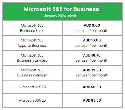 Microsoft 365 Pricelist Jan 2024